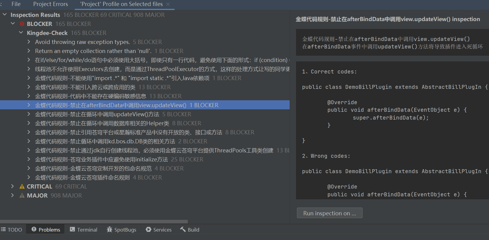 右键项目工程目录,在右侧菜单中,点击“金蝶代码分析/金蝶代码扫描”功能,即可实现对该工程代码的静态代码扫描。